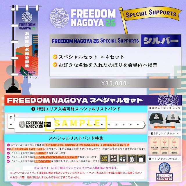 FREEDOM NAGOYA Special Supports シルバー ・スペシャルセット ×4セット ・お好きな名称を入れたのぼりを掲示 FREEDOM NAGOYA Special Supports 入場無料フェス「FREEDOM NAGOYA」をサポートしたいというお客様から、ありがたいご提案を多数頂きましたため、FREEDOM NAGOYA Special Supports セットを販売致します。 ご本人様のお名前、推しのアーティスト名、お勤めの企業名、宣伝したい内容など、お好きな名称を記載した「のぼり」を当日会場内に設置させて頂きます。 最終日には記念としてお持ち帰り頂けます。 ※設置期間:5/16(土)・17(日) ※設置場所は現時点では未定となります。 ※のぼりの名称について 公序良俗に反する名称の使用は禁止とさせて頂きます。